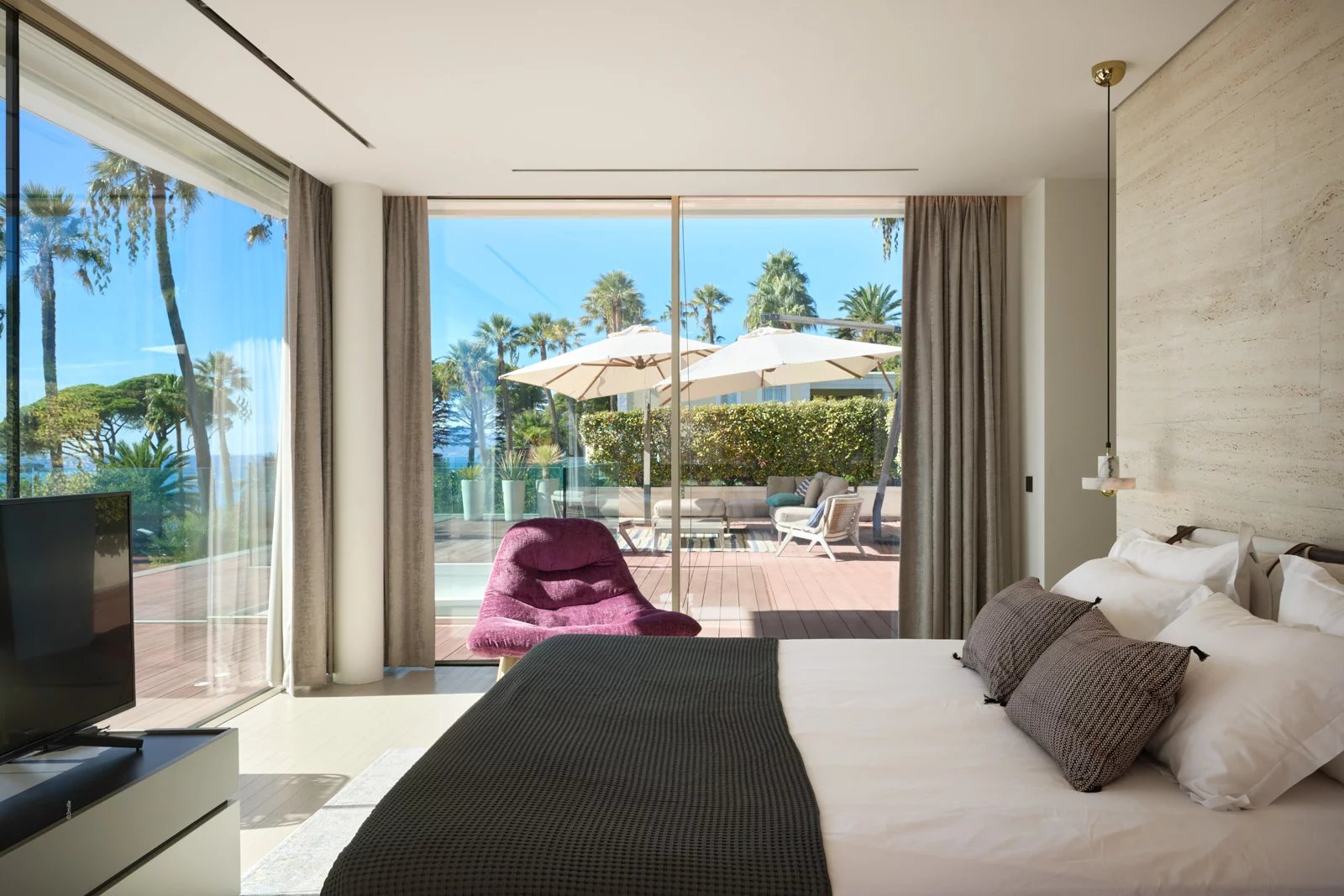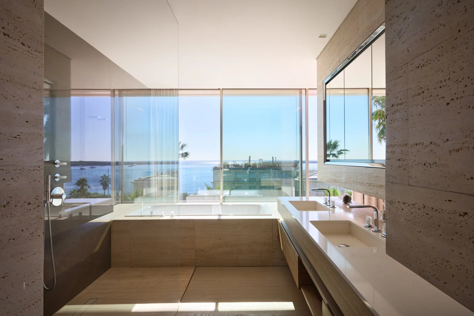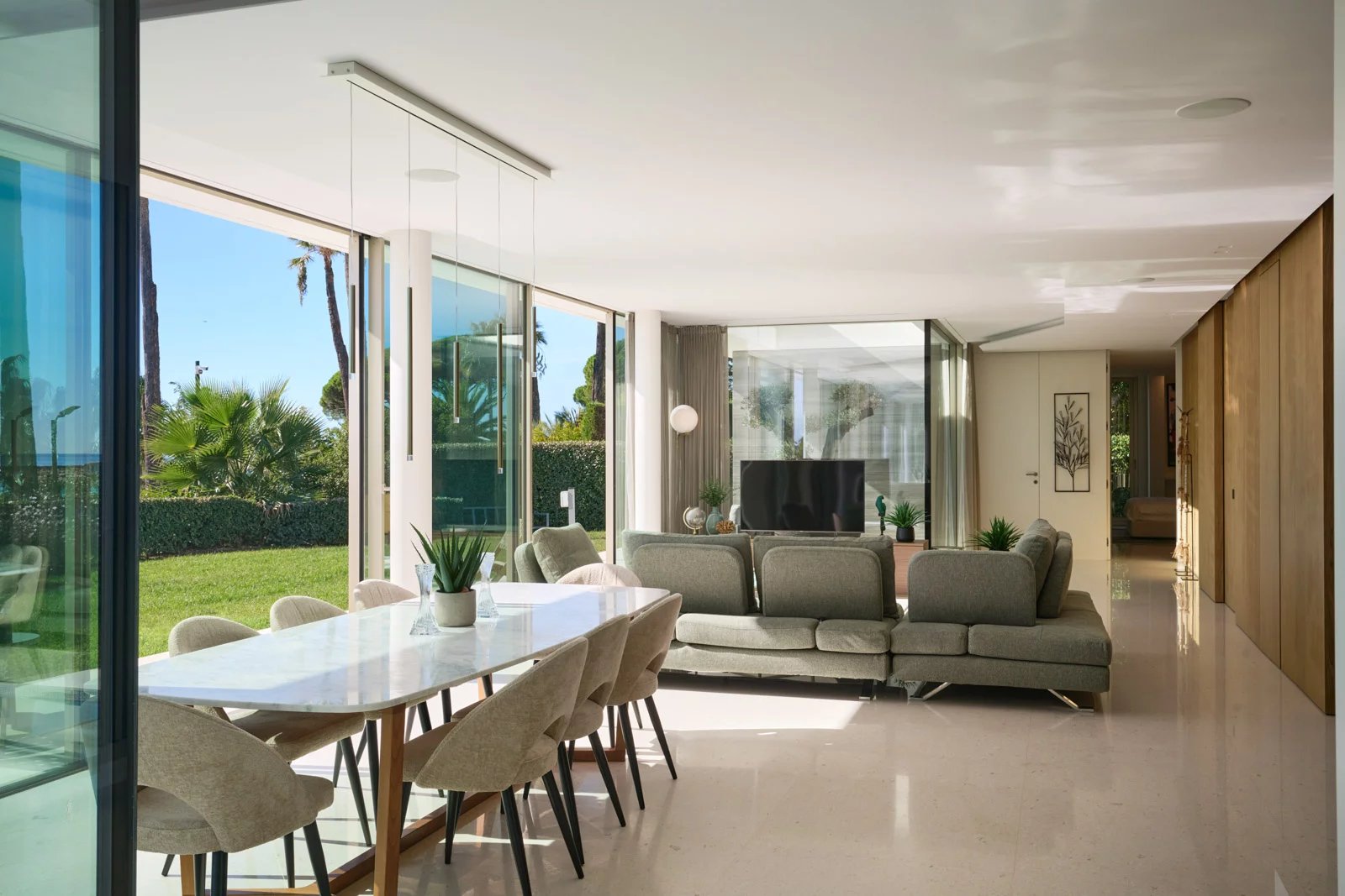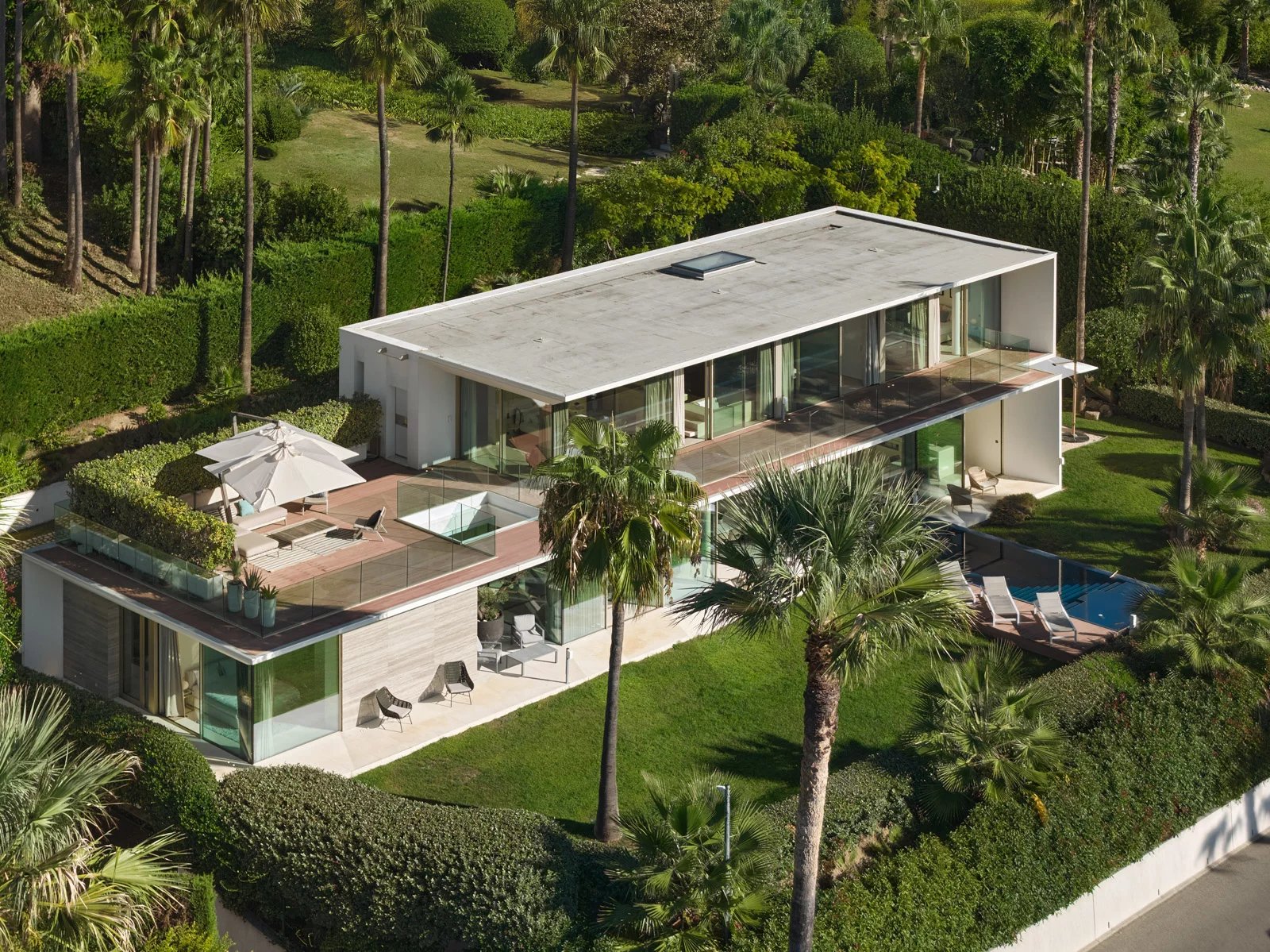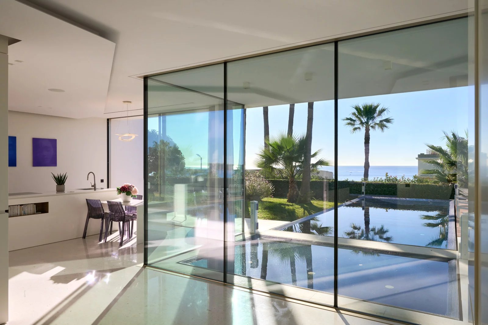 Sur près de 550 m² de superficie totale, elle dispose d’un hall avec une impressionnante fenêtre SkyDome qui offre un superbe panorama sur la piscine, le jardin et la mer en prolongement.